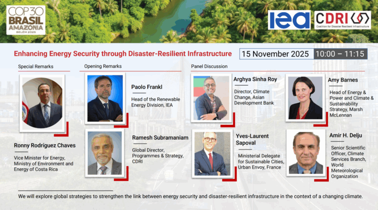 You are warmly invited to join the IEA and CDRI for a high-level panel discussion at COP30: Enhancing Energy Security through Disaster-Resilient Infrastructuređź“… Saturday, 15 November 2025đź•™ 10:00–11:15 BRT | 14:00–15:15 CET📍 DRI Pavilion (PV-C100), Blue Zone This session will bring together global leaders and experts to explore how resilient, climate-proof energy systems can strengthen […]