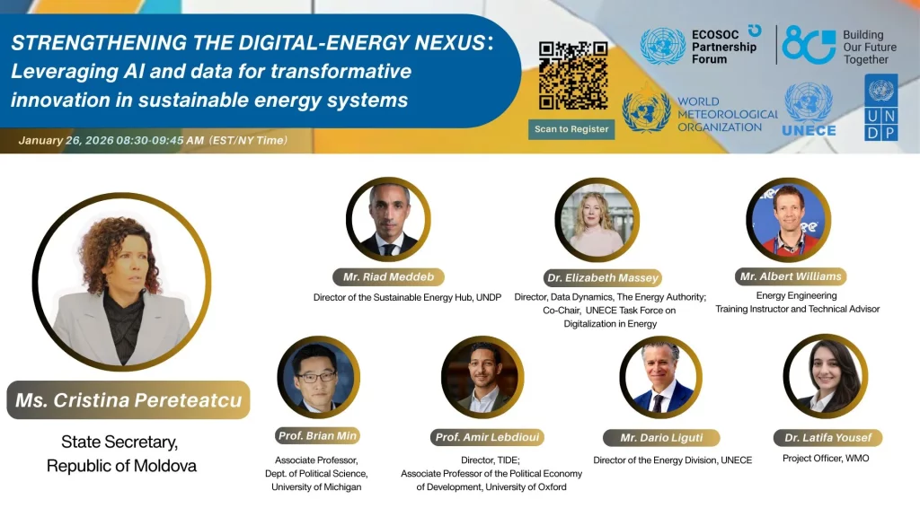 On 26 January 2026, the World Meteorological Organization (WMO), the United Nations Development Programme (UNDP), and the United Nations Economic Commission for Europe (UNECE) co-hosted a side event at the 2026 ECOSOC Partnership Forum focused on strengthening the digital–energy nexus through data, artificial intelligence (AI), and innovation. Held on the International Day of Clean Energy, the event convened policymakers, practitioners, researchers, and development partners to explore how digitalization can accelerate a just and inclusive energy transition, enhance climate resilience, and unlock sustainable finance, particularly in regions undergoing rapid transformation.